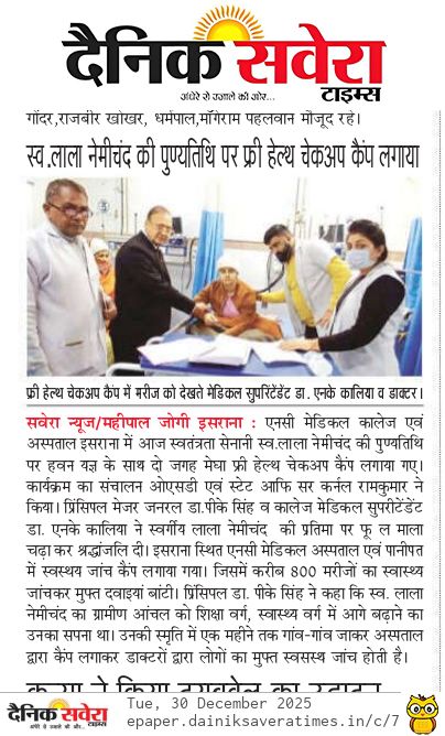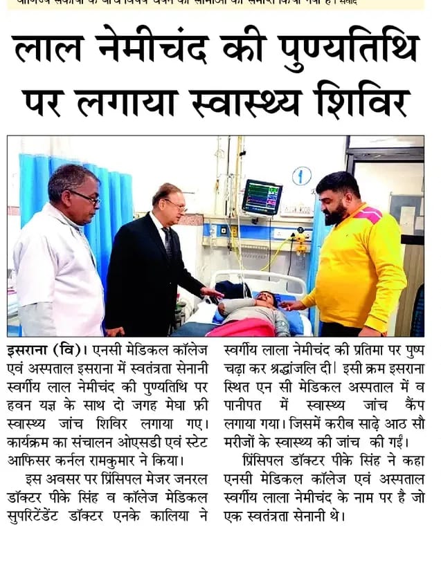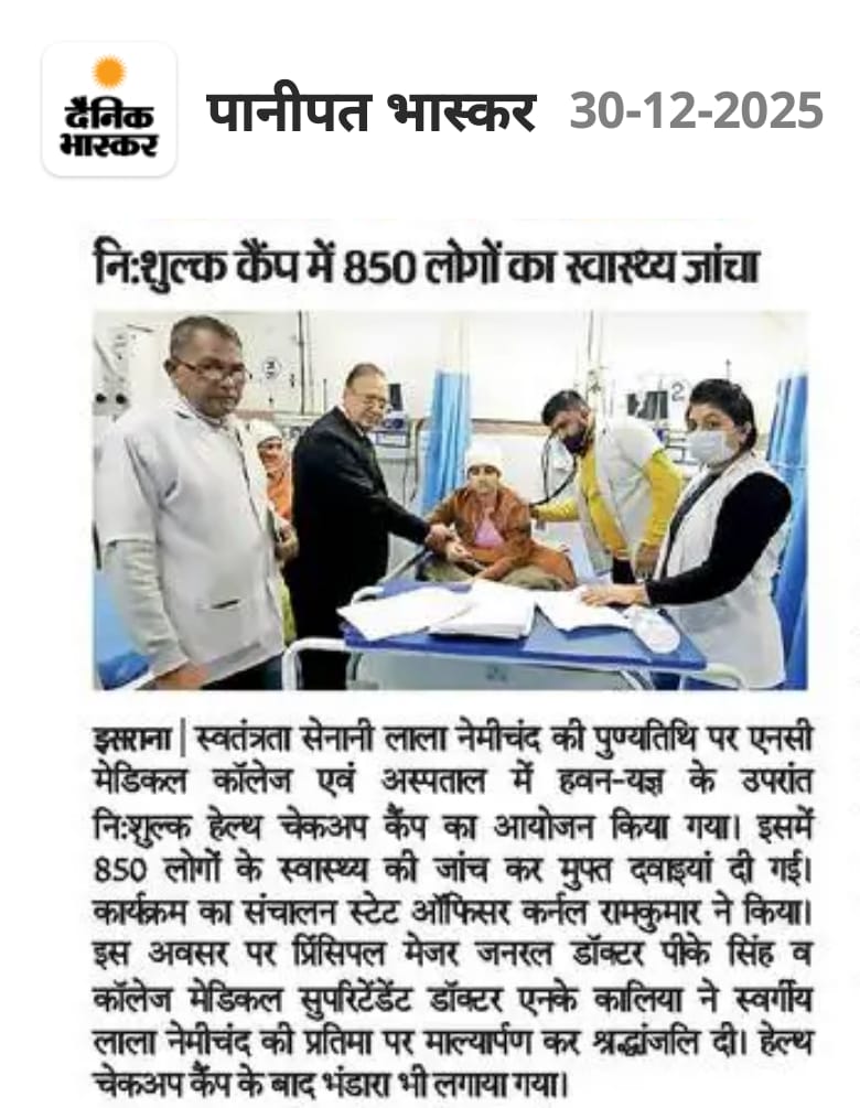 स्व. लाल नेमीचंद की पुण्यतिथि पर हवन यज्ञ उपरांत फ्री हेल्थ चेकअप कैंप लगाए गए administrator January 1, 2026 https://www.facebook.com/reel/848652864723636 You Might Also Like Holi Festivals at NC Medical College March 16, 2025 शिवर में 51 मरीजों का जाँचा स्वास्थ्य व बनाए आयुष्मान कार्ड June 2, 2025 भारत का वैक्सीनेशन का स्टेटस दुनिया भर में सबसे ऊपर : डॉ. पवन कुमार May 19, 2025